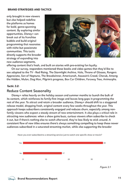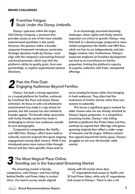 From our insights, we reimagined Disney+ not just as a streaming service, but as an immersive ecosystem of story, play, and connection. Our recommendations leaned into the IP that only Disney can claim, while opening new doors with music, gaming, sports, and fresh originals. The result: a roadmap for Disney+ to move past franchise fatigue and stand out as the most magical platform online